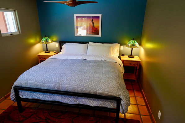 We got to work turning this little studio into a cozy, self-sufficient gem! We added everything it needed: a full fridge, a dishwasher, a washer/dryer, and even a comfy living area with a TV for movie nights. The king-size bed was a total game-changer. Outside, we added a grill and revamped the seating to create a sweet little hangout spot. Now, Saguaro Studio is the perfect tiny retreat where guests can kick back, cook in, and feel totally at home.